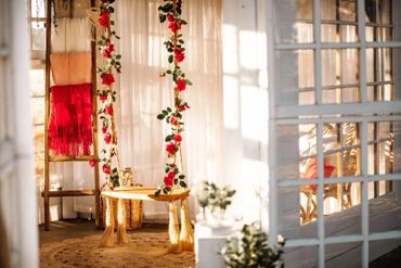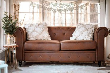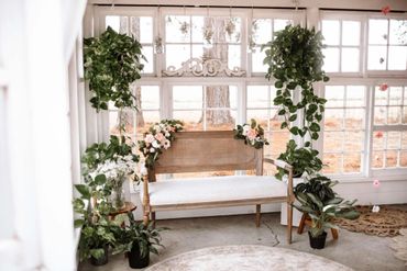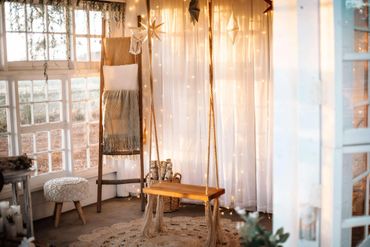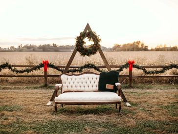 This is a sweet and simple set which includes our garland lined split rail fence and red bows, and our cream sofa paired with a triangle arch and wreath.